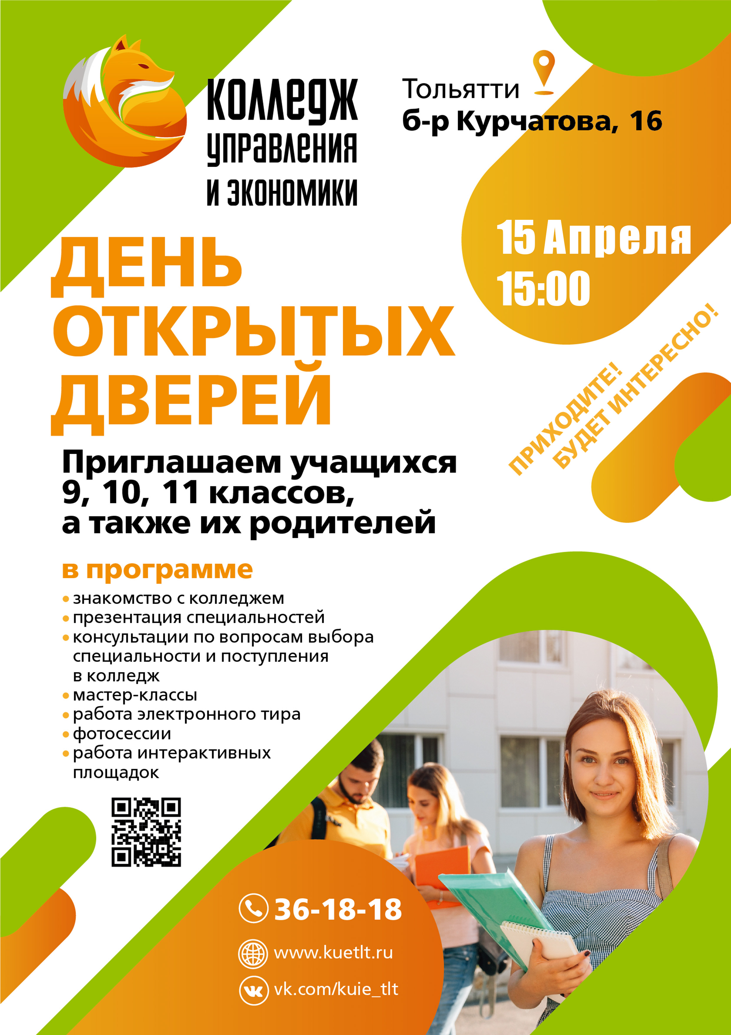 В программе: знакомство с нашими специальностями, мастер-классы, экскурсия по колледжу и встреча с преподавателями.